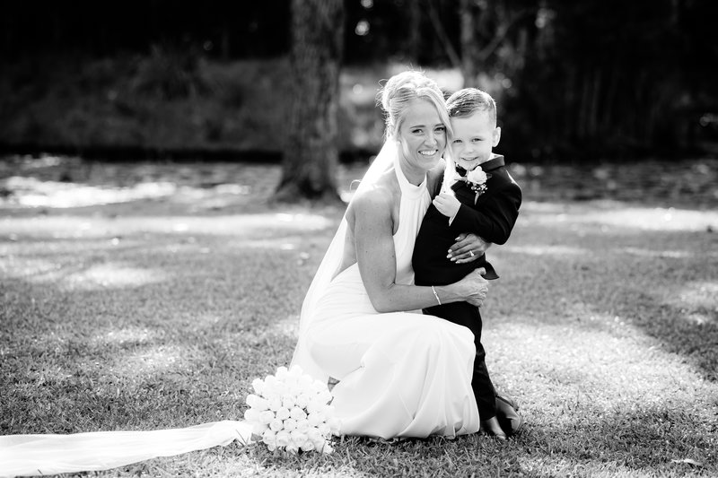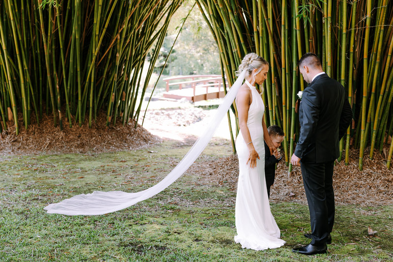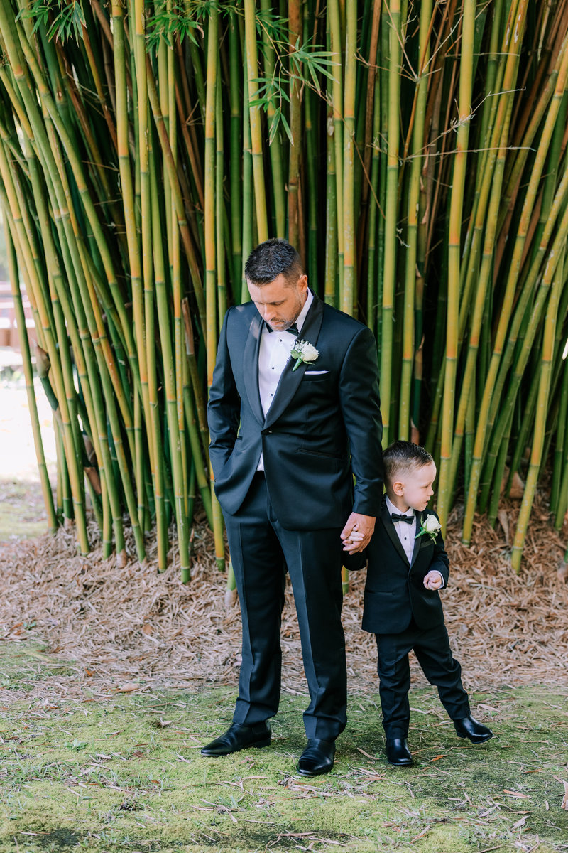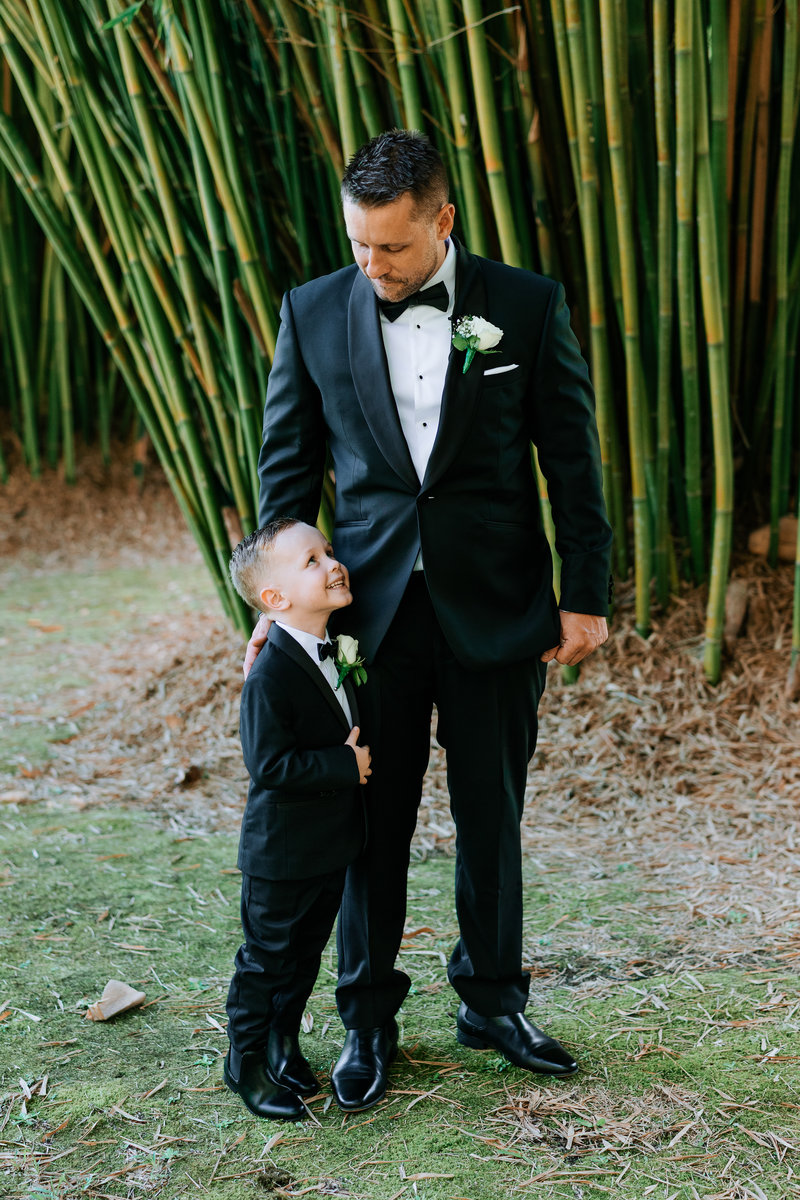 Groom portrait at our secret garden groom hugging four year old son at ceremony black and white portrait of groom and son in front of bamboo groom with parents